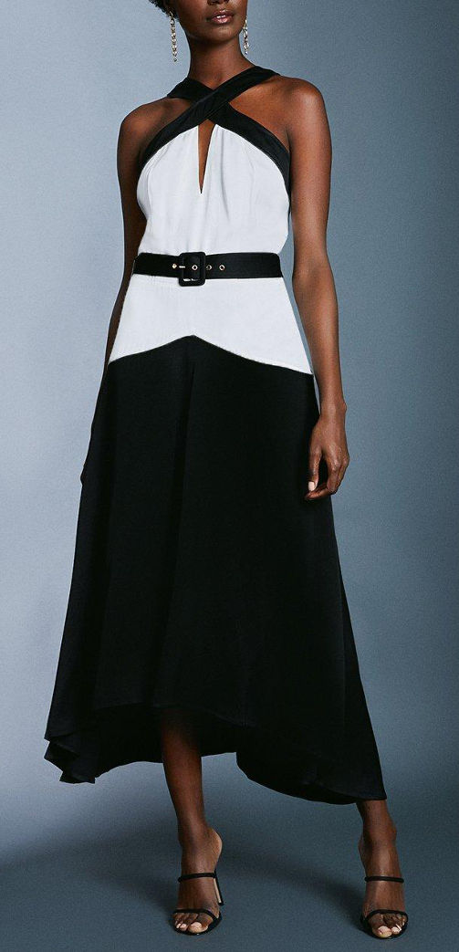 KAREN MILLEN Colour Block Satin Crepe Dress With Belt (RARE & COLLECTABLE)